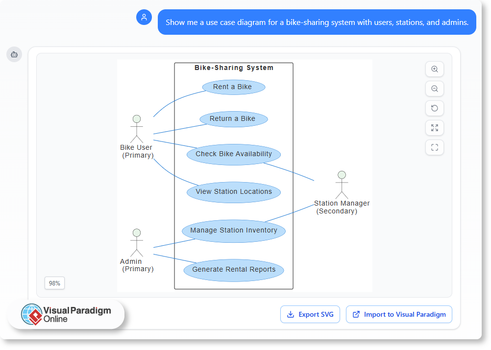 “Show me a use case diagram for a bike-sharing system with users, stations, and admins.”