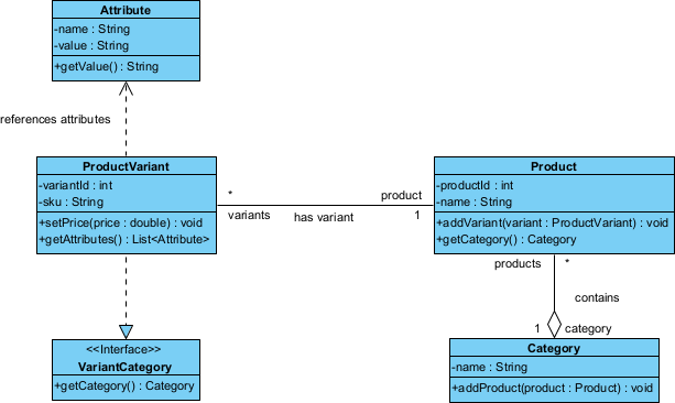 productName, price, color, or material.calculateDiscount() or validateStock().For e-commerce platforms, Class Diagrams help organize product variations—like size, color, and material—into a maintainable, extensible structure. Without them, teams risk inconsistent data models and bloated code.
