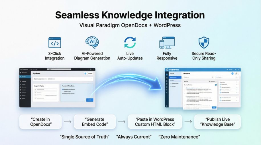 In today’s fast-paced digital workplace, knowledge shouldn’t live in silos. Teams need instant access to documentation, diagrams, and processes exactly where they work—whether that’s a company intranet, a client portal, or a public-facing WordPress site. Visual Paradigm OpenDocs transforms this vision into reality with its powerful Embed Code feature, allowing you to seamlessly integrate rich, interactive knowledge bases directly into your website.